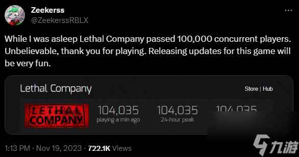 一款体谅不大但乐趣十足的多人合作恐怖探索新游《Lethal Company》Steam玩家同时在线峰值破10万,开发商Zeekerss日前公布了这个消息,本作已经上架Steam,目前收获好评如潮,感兴趣的玩家可以关注下了。