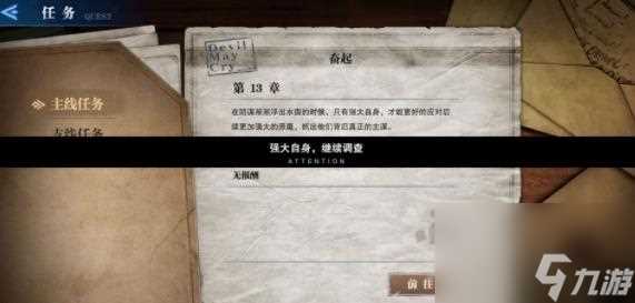 奋起任务的说明是“强大自身,继续调查”,但没有具体的完成方法。这是因为公测版本的游戏主线只开放到第十三章节,之后的内容需要等待后续的版本更新后才能够探索。因此接取到这个任务的玩家暂时是无法完成的,需要等待版本的更新。