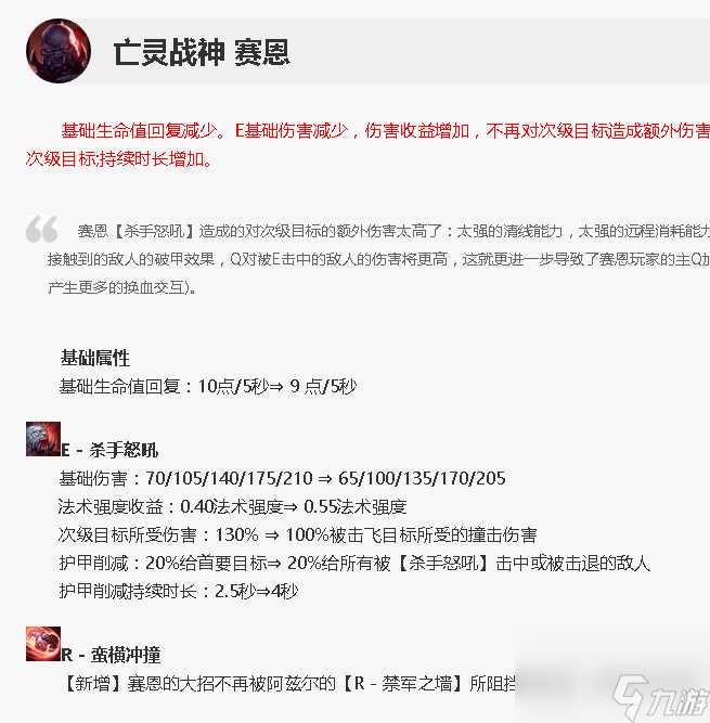 之前版本英雄的中单号令之旗彗星塞恩受到削弱后一去不复返,E不再有额外伤害,清线速度减少,而最主要的装备号令之旗移除,令中单塞恩成为历史,最大受害者属塞恩无疑。