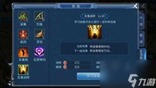 一、生活技能栏里面有个技能叫做【五鬼运财】,通过消耗帮贡和银票(银两)来提升。