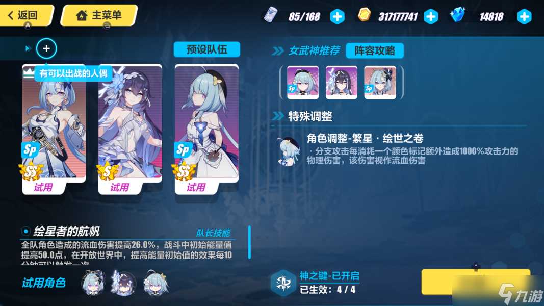 ✦「星火重燃·画彩」关卡的必要出战角色为「繁星·绘世之卷」,特殊改动是分支攻击可以造成额外伤害,在正常循环中即可自动触发,无需特意使用。使用试用提供的「天行·绘星之卷」流血物理队或者「女武神·热砂」流血物理队均可完成挑战。