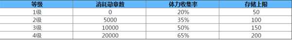 如果玩家还没有升级过,那么初始的体力食盒就是就是1级,玩家体力收集率只有20%,存储也只有50体力,如果自己的勋章数达到5000,那么就可以升级到2级,这时候体力收集率有35%,可以存储的体力是100。