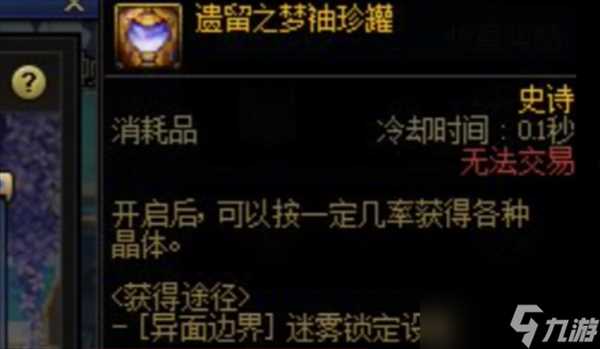 地下城与勇士游戏中的遗留之梦袖珍罐,是一个赌狗道具,可以在每周消耗2000迷雾升级之后,都可以获得一个遗留之梦袖珍罐,是异面边界副本中产出的,但对迷雾的消耗比较大,也可以使用金币来进行提升。