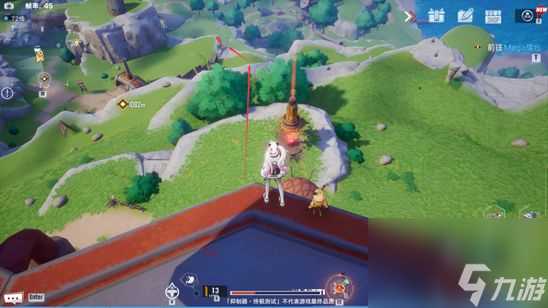 传送到班吉斯农场,我们往南走到遗迹B-03周围,接着用喷气上到左边山丘,之后往南走,我们走到一处平坦的草地处,再走到下面一层平坦草地,往断桥走即可看到该风景点。
