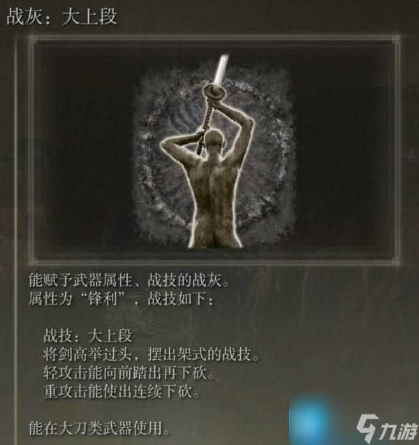 艾尔登法环大上段在墓地平原靠上的一个湖获得,激活赐福大桥北方,赐福大桥北方在赐福三叉口的十字记号上方。