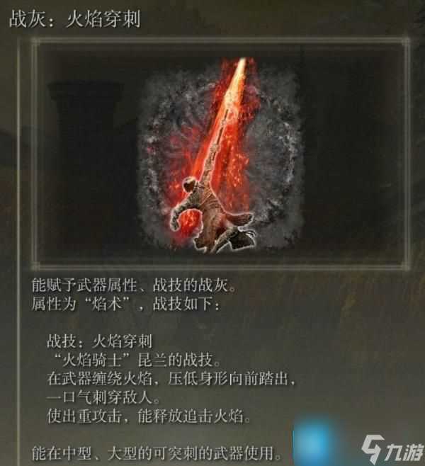 艾尔登法环火焰穿刺需要击败火焰骑士昆兰获得,从赐福民宅小祭坛右上的门走,走到尽头,在喷泉区域击败火焰骑士昆兰的入侵。