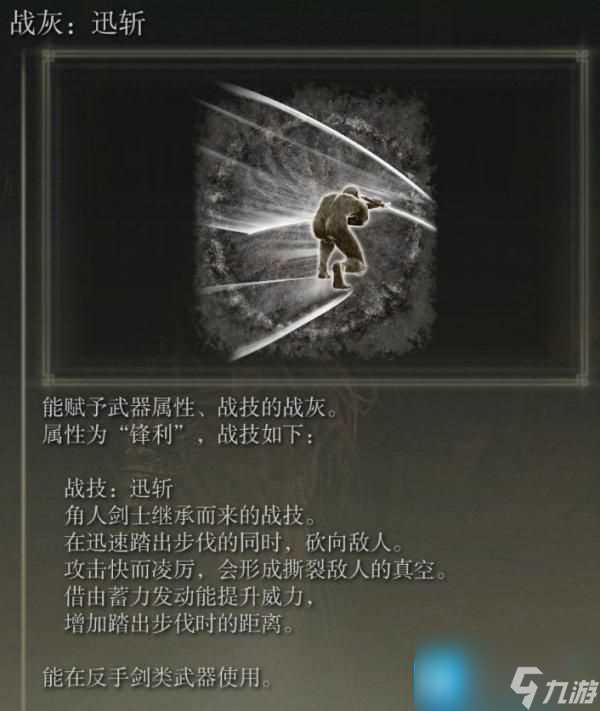 艾尔登法环迅斩帮助角人击败蕾妲获得,需要完成角人的一系列支线,在击败梅瑟莫之前击败双月骑士,然后前往赐福大道旁的十字记号。