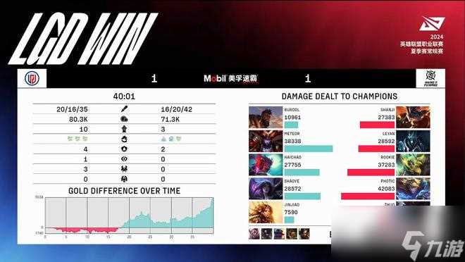 结果第一局比赛,打成了NIP的单方面碾压局。4分钟左右,Rookie卢锡安中路成功对位单杀小炮收下一血,同时上路完成2越1击杀奎桑提;9分钟左右,双方下路爆发团战打出1换1,莉莉娅收下人头天肥开局;19分钟左右,双方下路二塔爆发团战,NIP且战且退打出2换1;32分钟左右,NIP先行击杀LGD两人收下大龙,但随后兰博被换掉;41分钟左右,NIP收下大龙,随后追击击杀LGD多人;最终45分04秒,LGD拿下远古龙但NIP团战取胜打出ACE,成功一波结束比赛。