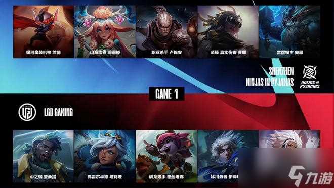 第一局比赛,NIP蓝色方,禁用杰斯,布隆,乐芙兰,龙女,翠神,选用兰博,莉莉娅,卢锡安,赛娜,奥恩;LGD红色方,禁用豹女,蕾欧娜,鳄鱼,滑板鞋,女枪,选用奎桑,岩雀,小炮,伊泽瑞尔,芮