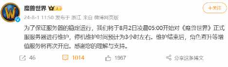 而对于今日这种情况,官方发文表示“为了保证服务器的稳定运行,我们将于8月2日凌晨05:00开始对《魔兽世界》正式服服务器进行维护,停机维护时间预计为3小时左右。维护结束后,角色直升等增值服务将再次开启。感谢您的理解与支持。”