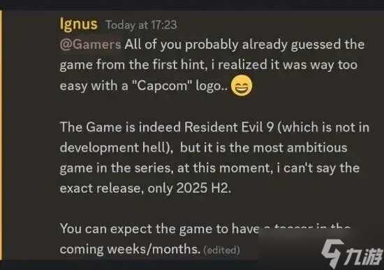 舅舅党在Discord上分享了三张线索图片,包括一个打了码的卡普空LOGO、一张标有2025的日历,还有一个数字“9”的大图。这些线索暗示了游戏的来临。
