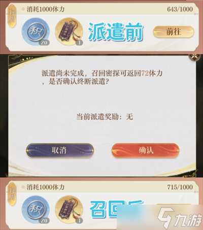 这里提一句,派遣可以用来刷体力成就和密探特训,可以看到我在派遣之前是643/1000,召回派遣时的72点体力后,变成了715/1000,相当于白嫖任务进度,有耐心的殿下可以靠这个方法快速完成体力成就和密探特训