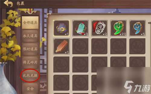 然后来到包裹界面后,点击左侧的【礼包兑换】这一项。
