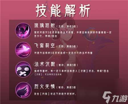 鸾的1技能【琉璃怒射】可以对随机的3名敌方灵妖造成法术伤害,并且在2个回合内使目标受到的伤害提高一定百分比,2技能【飞鸾裂空】是直接对敌方后排造成一定百分比的法术伤害。被动技能【法术沉默】在鸾每次行动都有几率触发,【烈火无情】则是对处于【灼烧】状态的敌方灵妖进行攻击时,伤害提升一定的百分比。