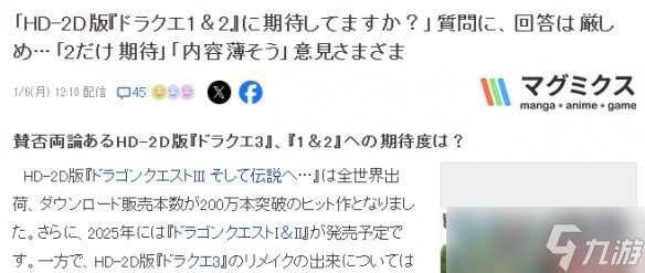 《勇者斗恶龙3:HD-2D》目前已正式上市,尽管伴随一些吐槽之声,但整体上仍收获了广泛好评与销售佳绩。近日,一家日本媒体公布了一项针对玩家的调查结果,该调查聚焦于玩家对于预计在2025年推出的前两部作品HD-2D重制版的期待程度。结果显示,《勇者斗恶龙1》的重制版并未激起太大波澜。
