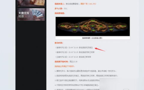 大唐无双无双城报名时间是什么时候 (诸侯时代以后)22:00~22:10 报名挑战无双城主。挑战者必须满足下列条件:携带无双令:每次挑战无论最后是否被选中为挑战者,都必须消耗一枚无双令。挑战规则按照先