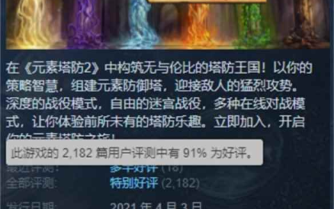 Steam特别好评游戏《元素塔防2》实现完全中文本地化! 今日,《元素塔防2(Element TD 2)》官方宣布,游戏已实现完全中文本地化。游戏当前售价60元,当前Steam评测为特别好评,在218