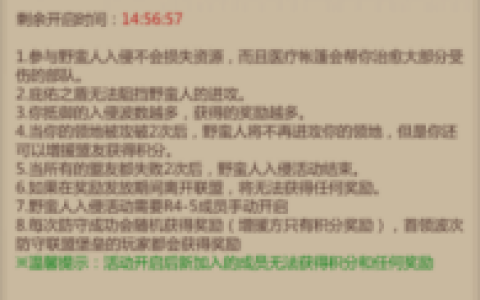 《侏罗纪军团》野蛮人入侵玩法TIPS 在开服到达必然天数!每次的最强领袖周的周二、周四会开启蛮横人入侵玩法! 1.到场蛮横人入侵不会丧失资源!并且医疗帐篷会帮你治愈大局部受伤的队伍! 2.庇佑之盾无法